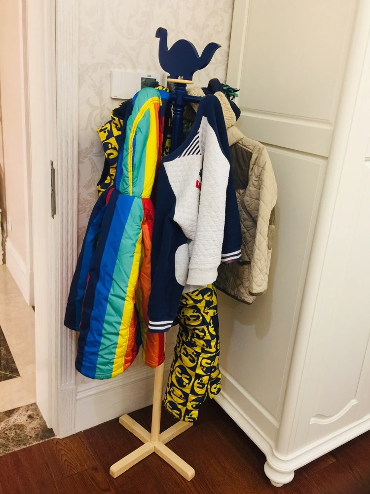 かわいいキャラクター付きのシンプルでモダンな無垢材キッズコートハンガー!子供部屋にぴったりの創造的なデザイン。お子様のお気に入りの服を楽しく掛けられる、収納力抜群のスタンドタイプ!
