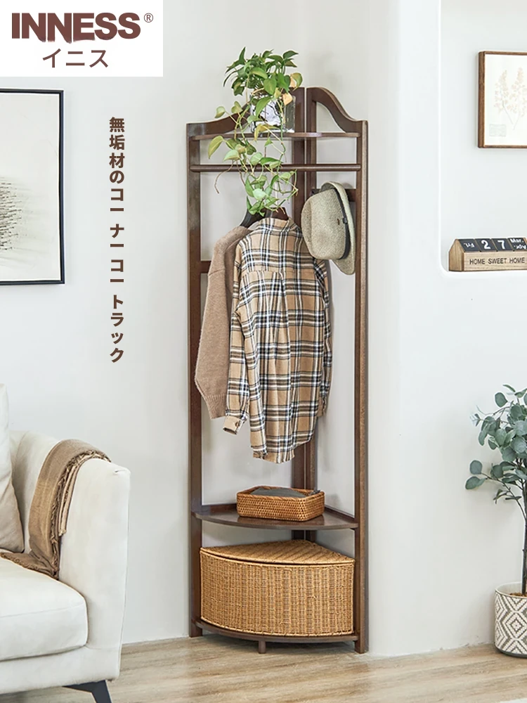 イニス天然木製コーナーコートラック - フロアタイプの寝室用ハンガー、玄関に最適な穴あけ不要の収納ラック!シンプルでおしゃれな衣類収納を実現します。