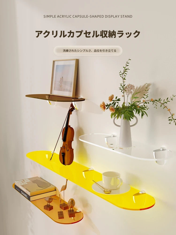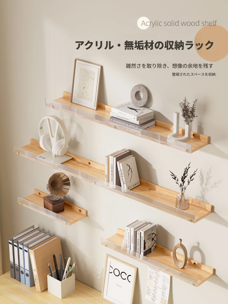 アクリル&ウッド壁掛け収納ラック - 穴なしで簡単取り付け!リビングや寝室のインテリアをおしゃれに演出し、スッキリ整理できるクリエイティブなアイテムです!