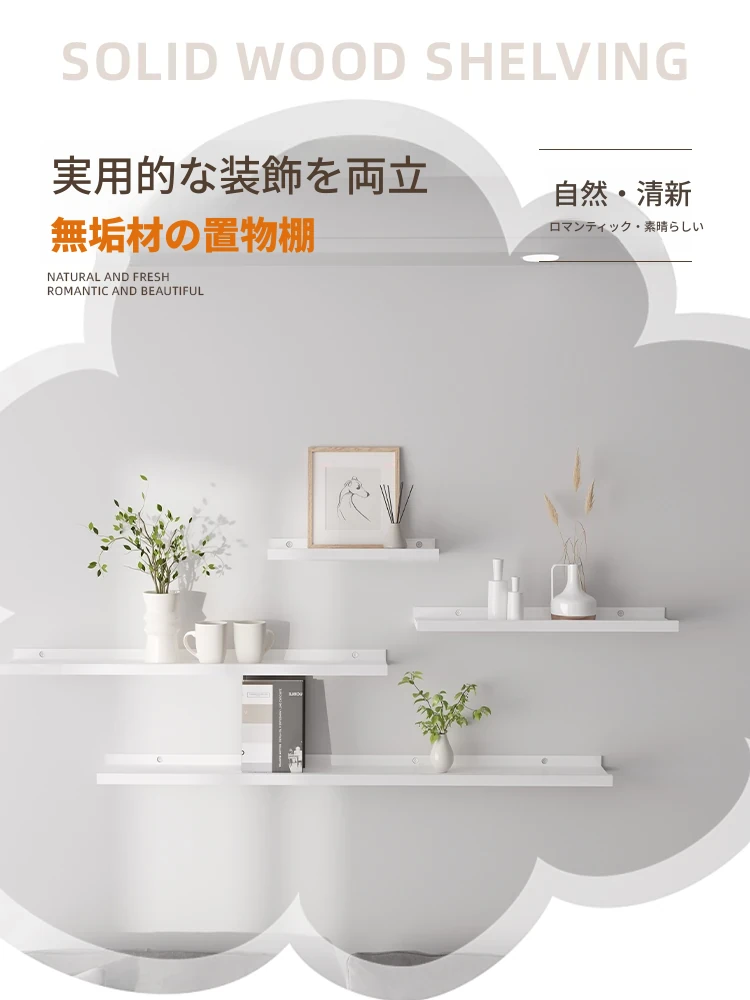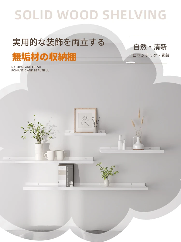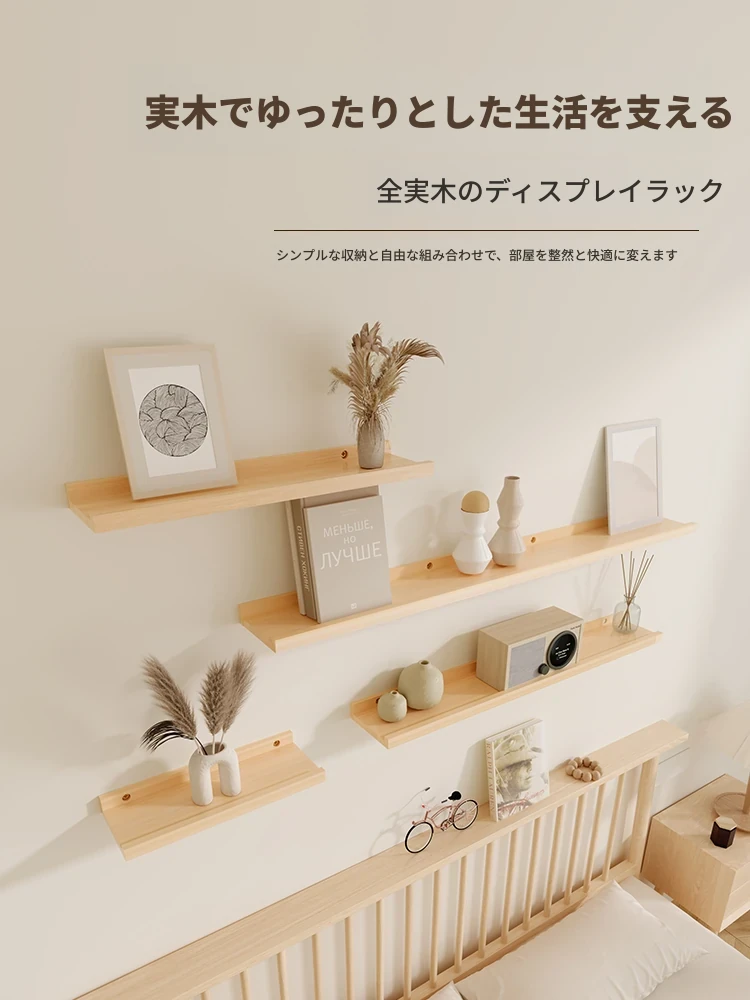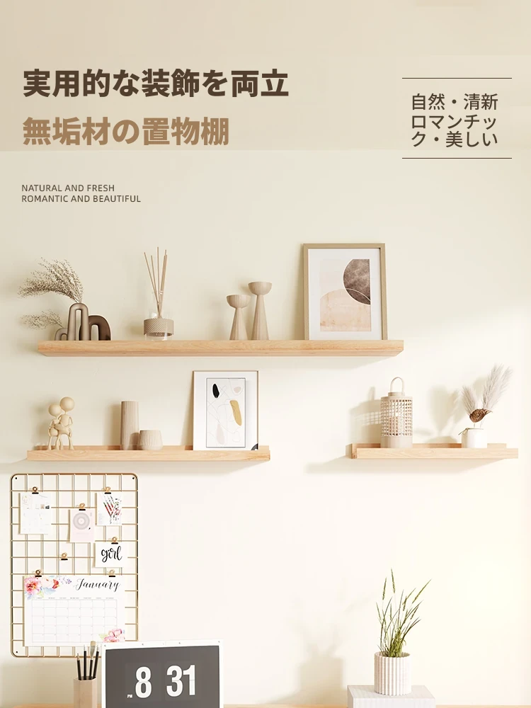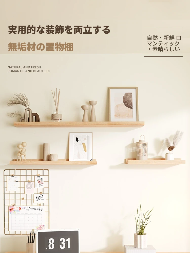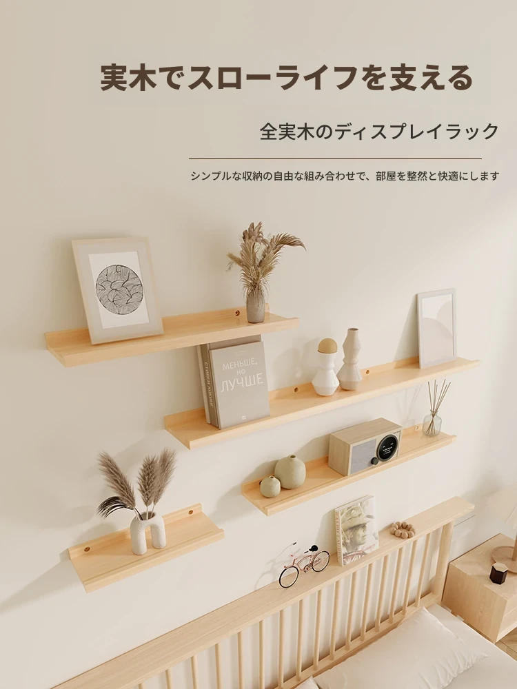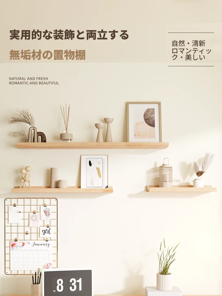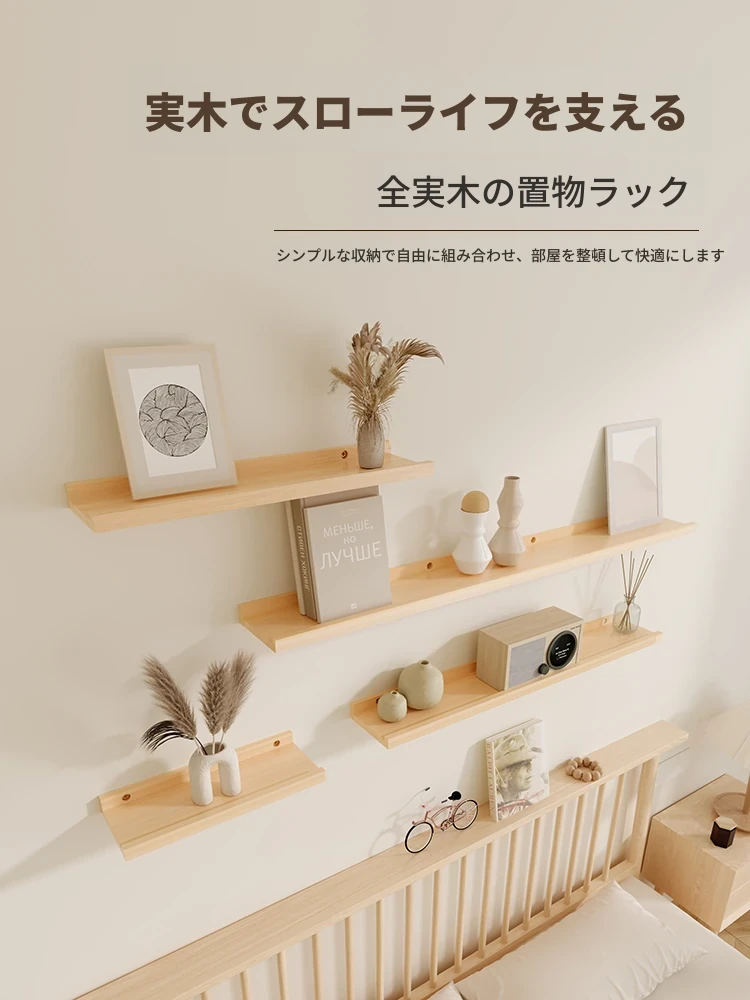 穴あけ不要!スタイリッシュな無垢材のウォールシェルフ、寝室やリビングに最適な装飾用一文字仕切り棚。壁掛けで空間を有効活用し、おしゃれに収納!