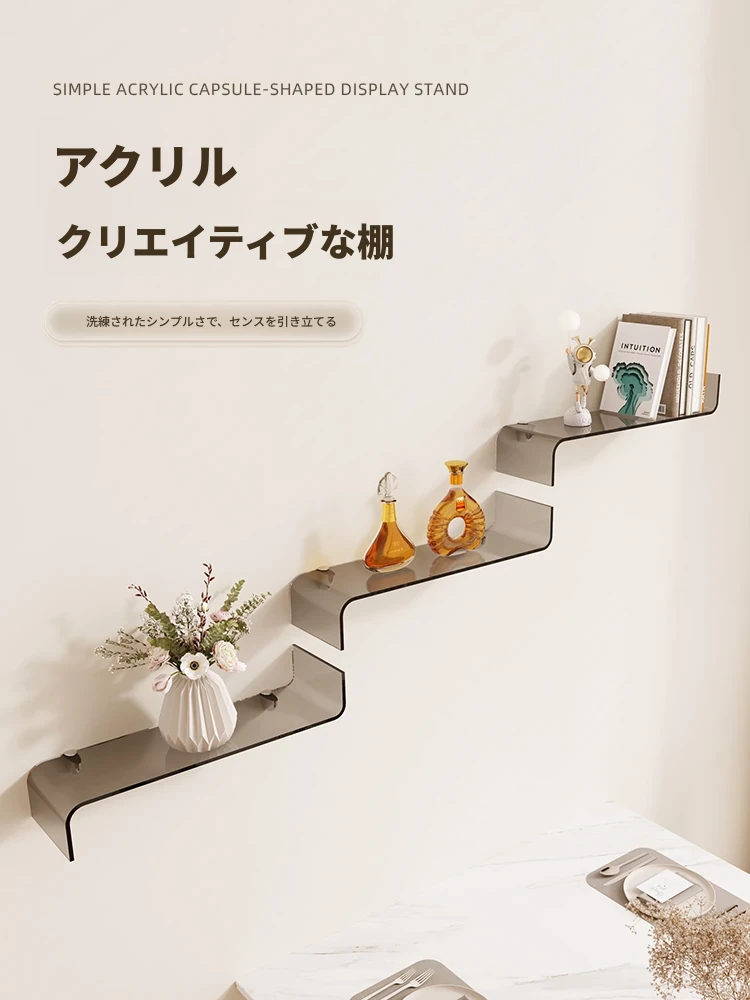 透明アクリル置物棚 - 壁掛け式の創造的な浮遊デザインで、リビングやバスルームに最適!おしゃれで機能的な収納スペースを実現し、インテリアを美しく演出します。