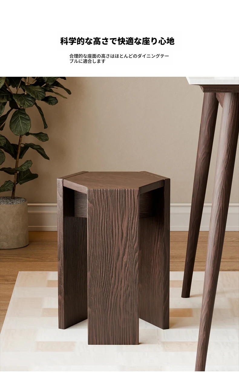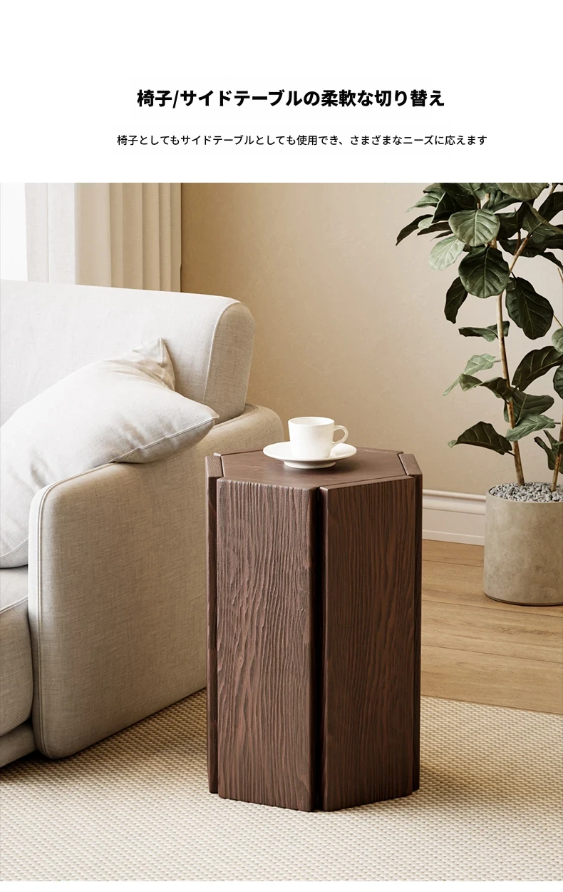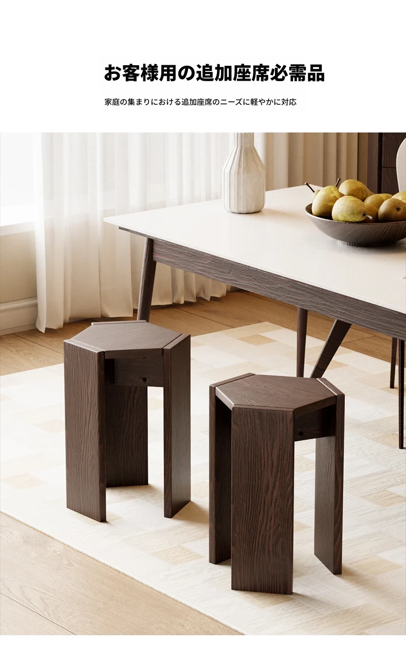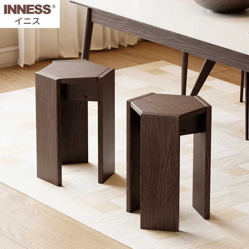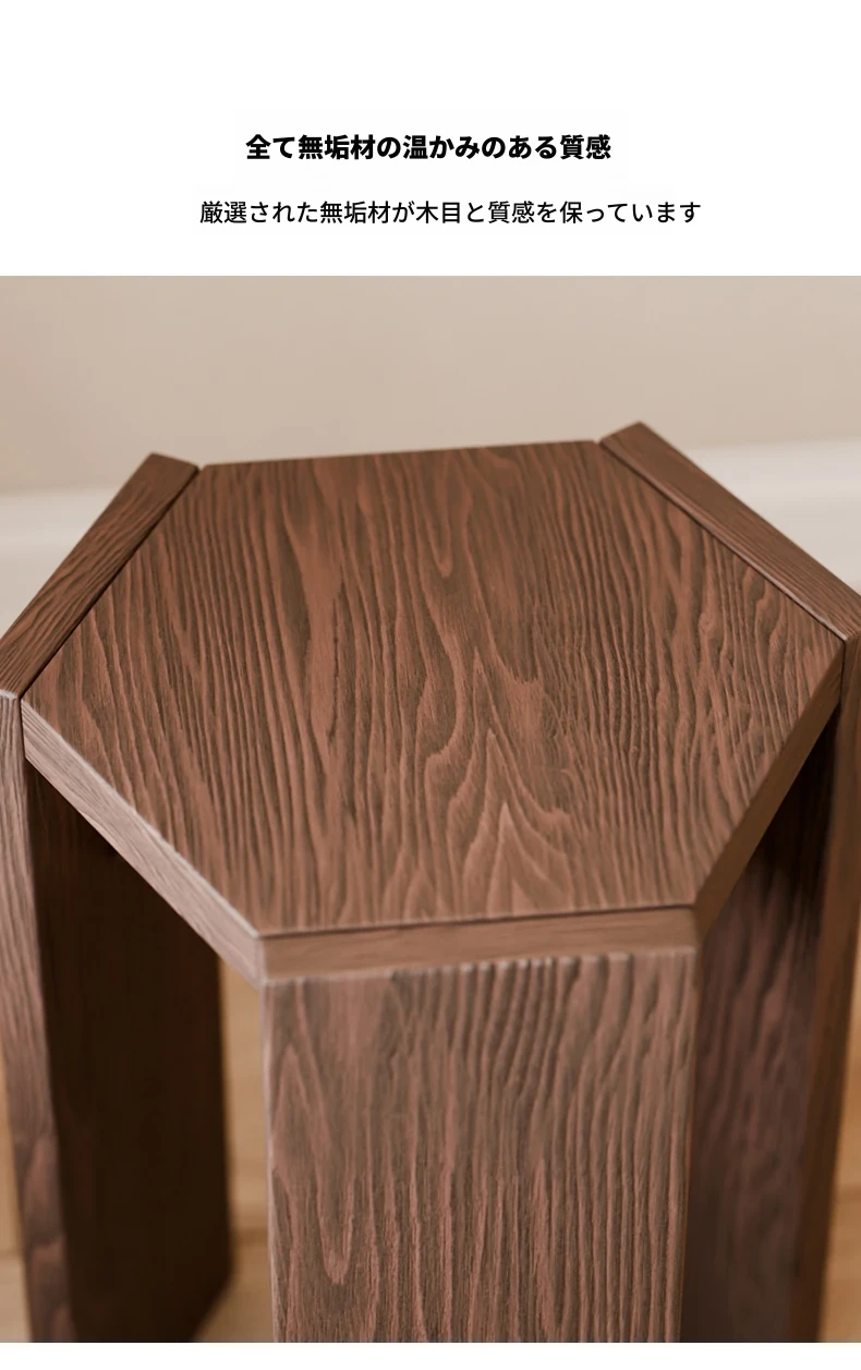 イニス天然木製スツール|厚手六角形デザイン|おしゃれなソファサイドテーブルやダイニング用に最適|スタッキング可能で収納も簡単|リビングやダイニングを彩るアイテム!