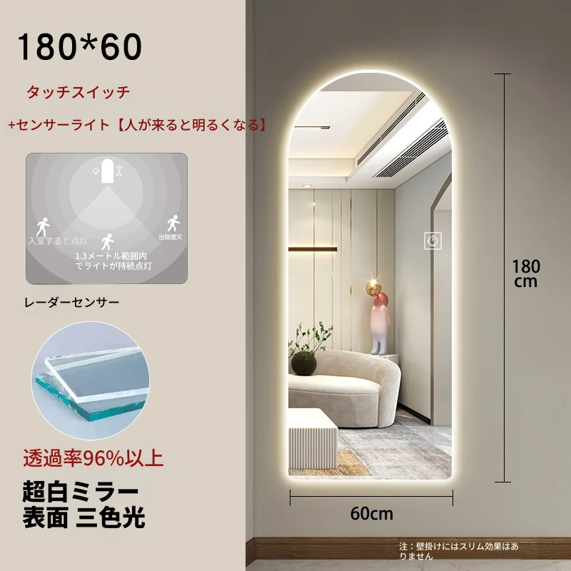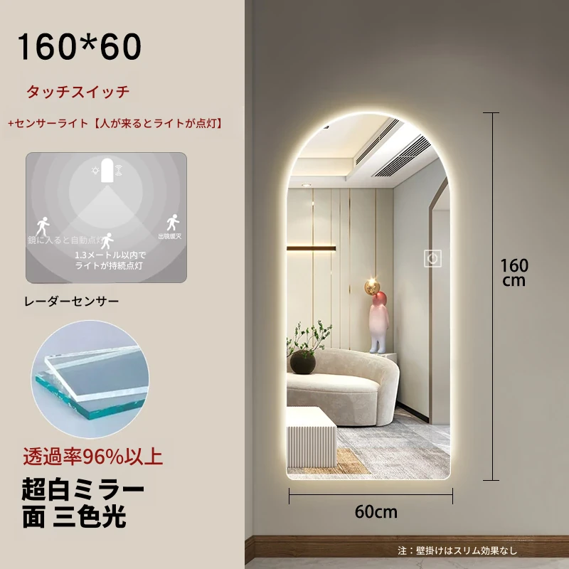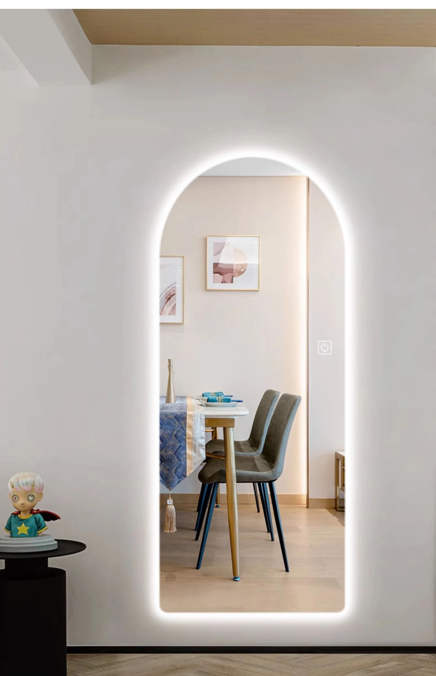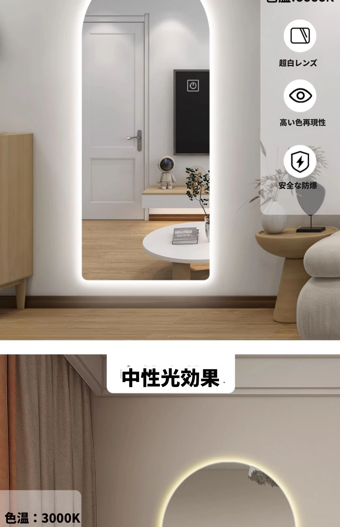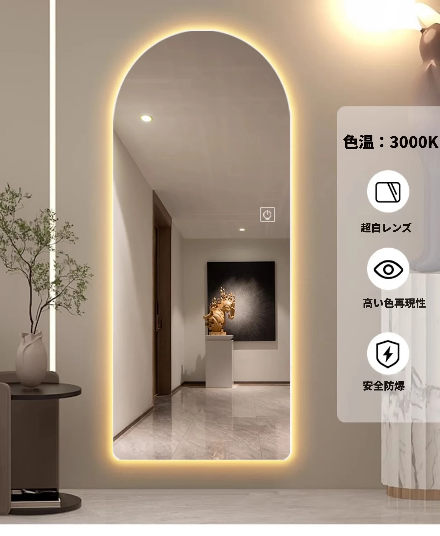 新型スマート衣装ミラー LED照明付き アーチ型全身鏡 壁掛けタイプ 玄関用フレームレス試着ミラー - おしゃれで便利な空間を演出!
