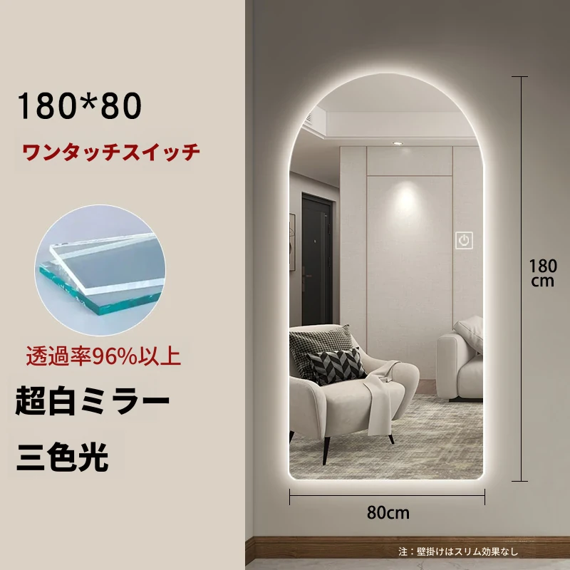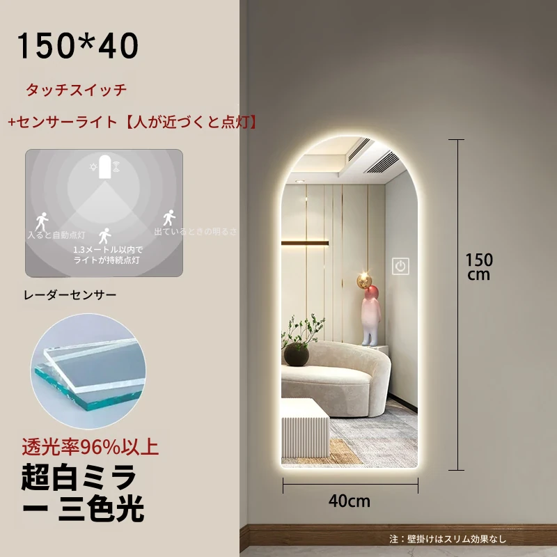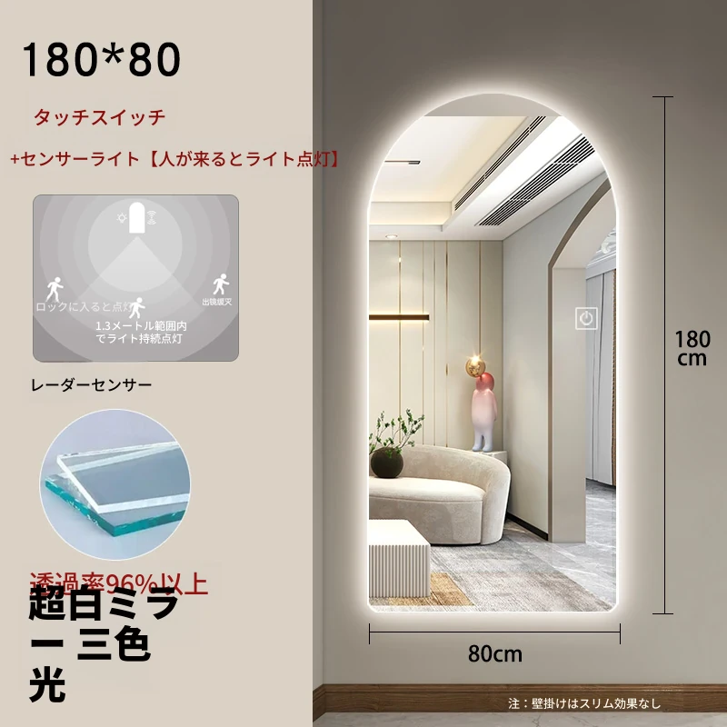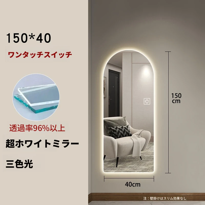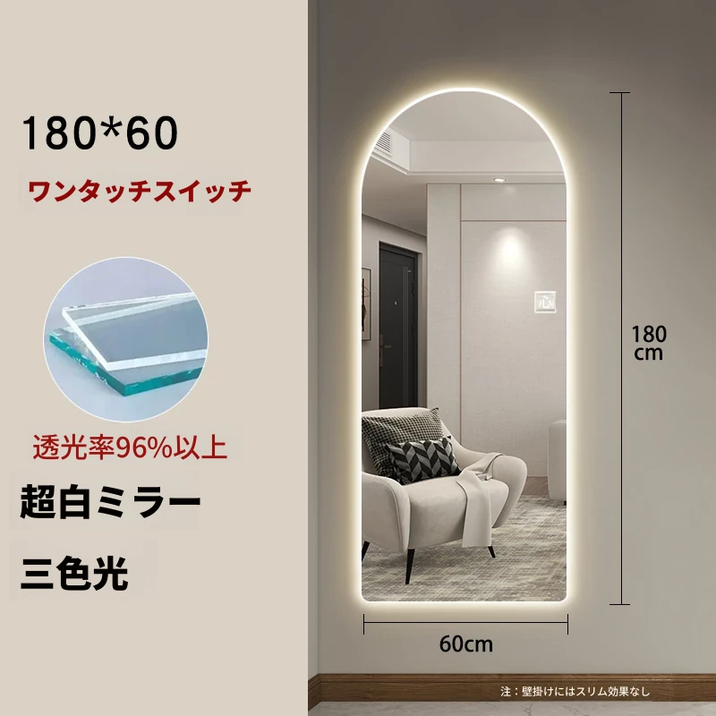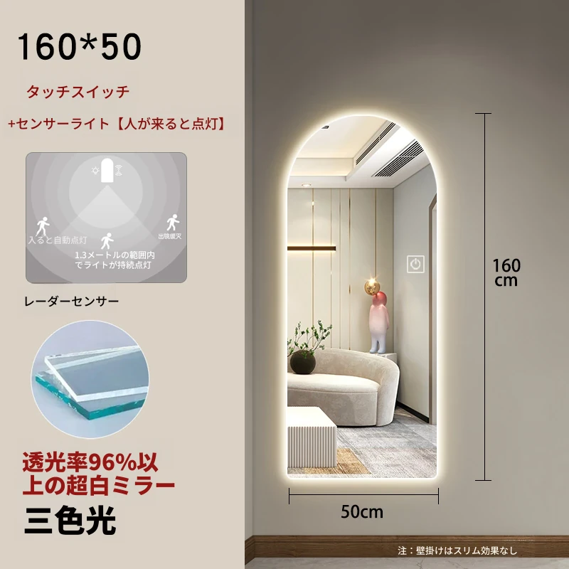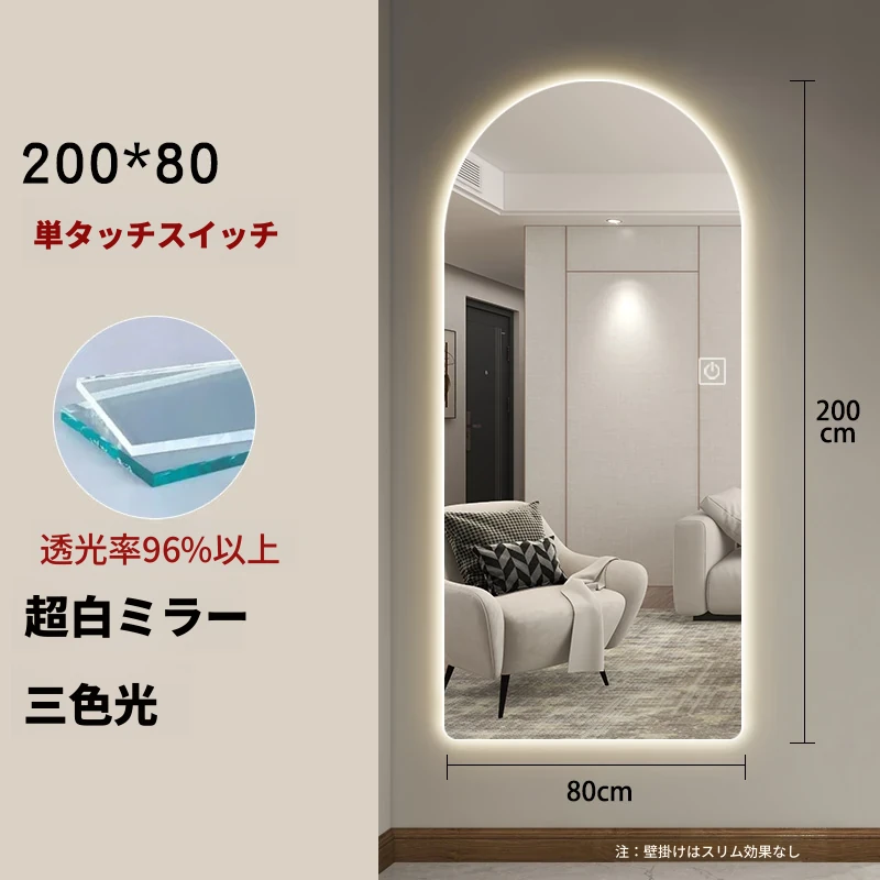 新型スマート衣装ミラー LED照明付き アーチ型全身鏡 壁掛けタイプ 玄関用フレームレス試着ミラー - おしゃれで便利な空間を演出!