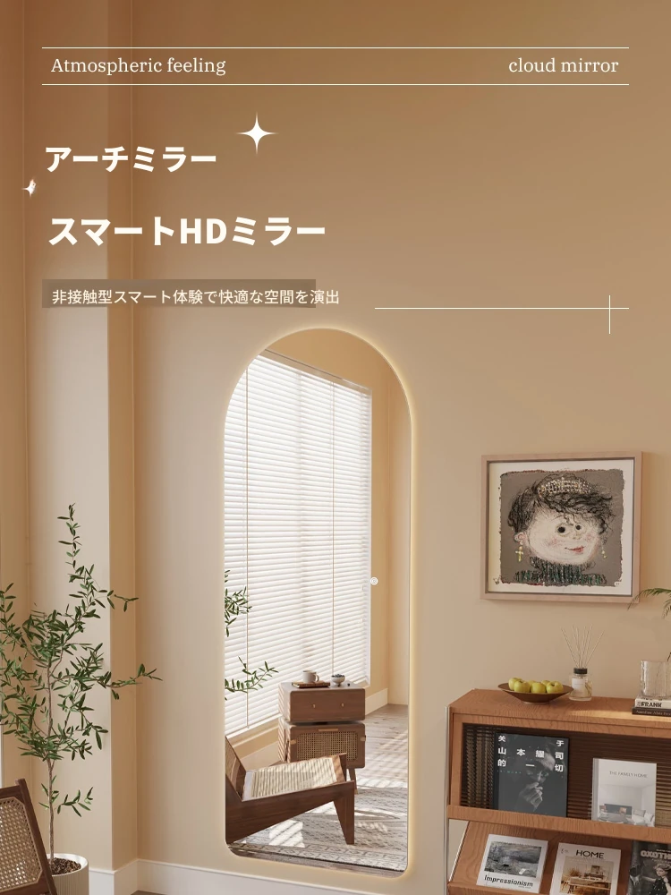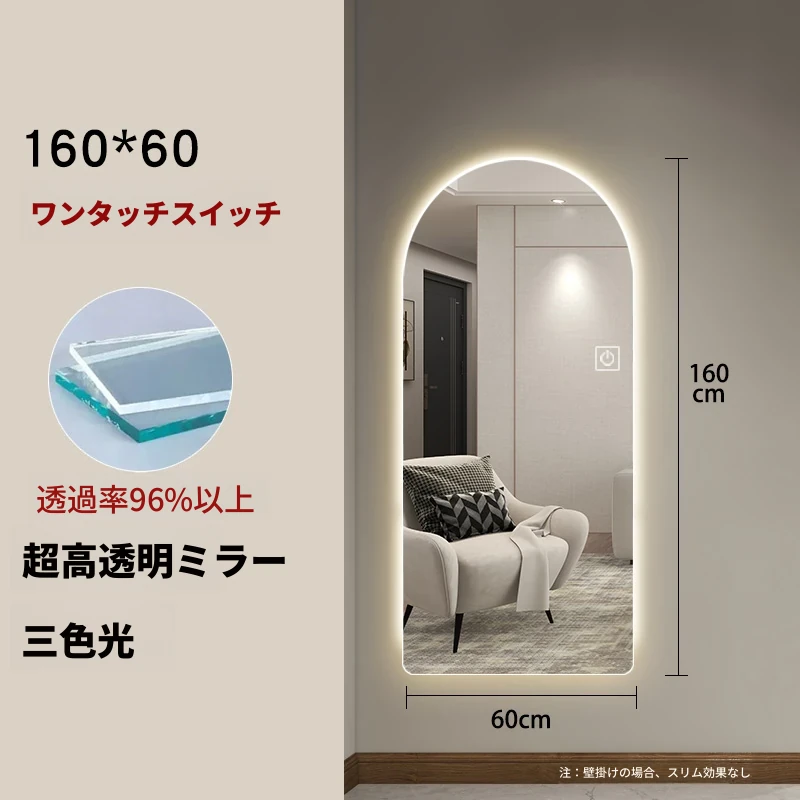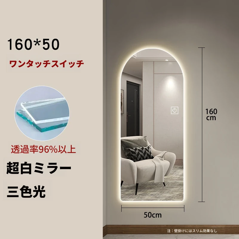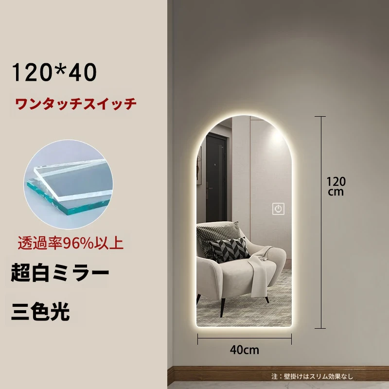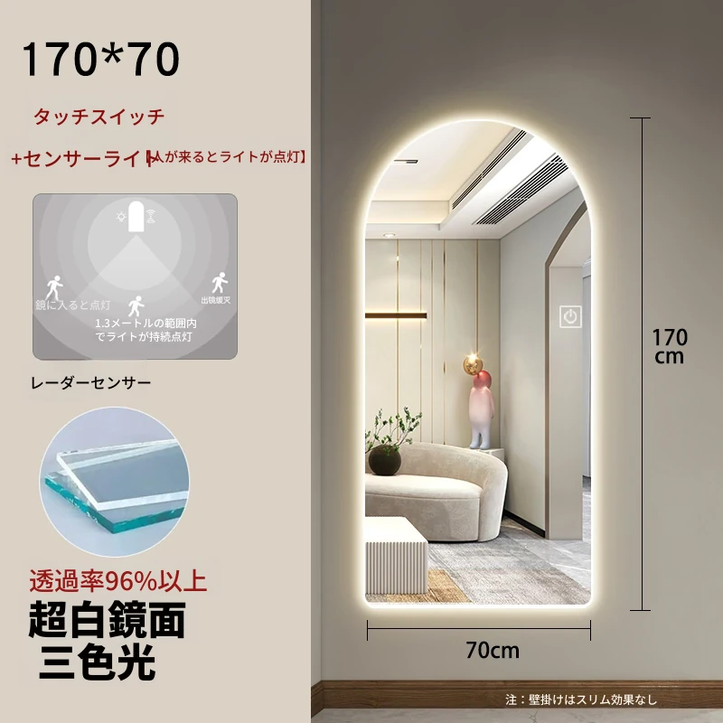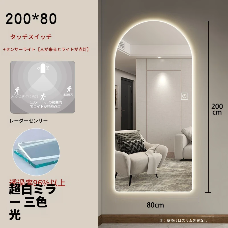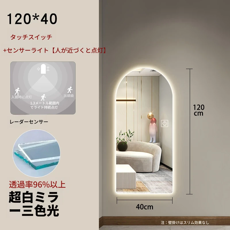 新型スマート衣装ミラー LED照明付き アーチ型全身鏡 壁掛けタイプ 玄関用フレームレス試着ミラー - おしゃれで便利な空間を演出!