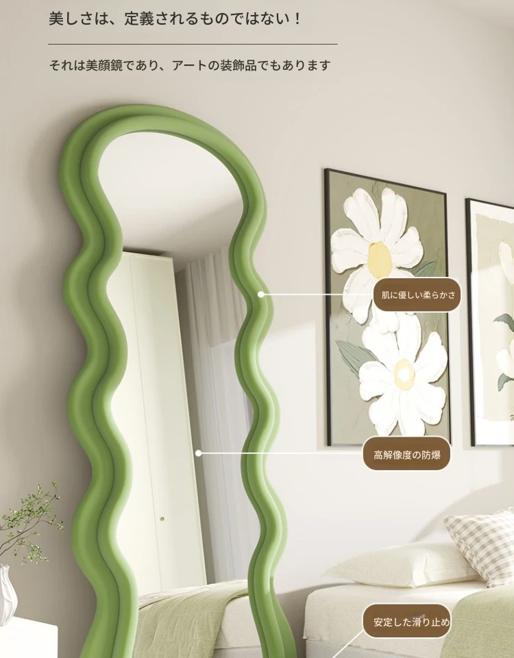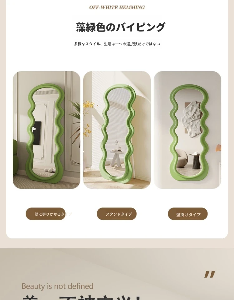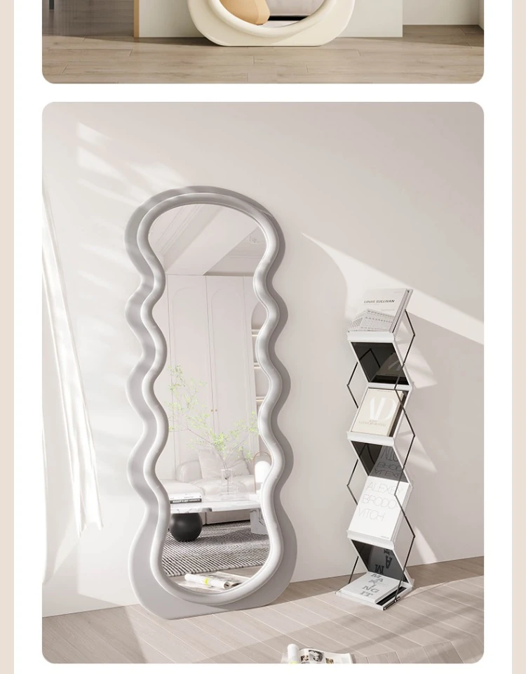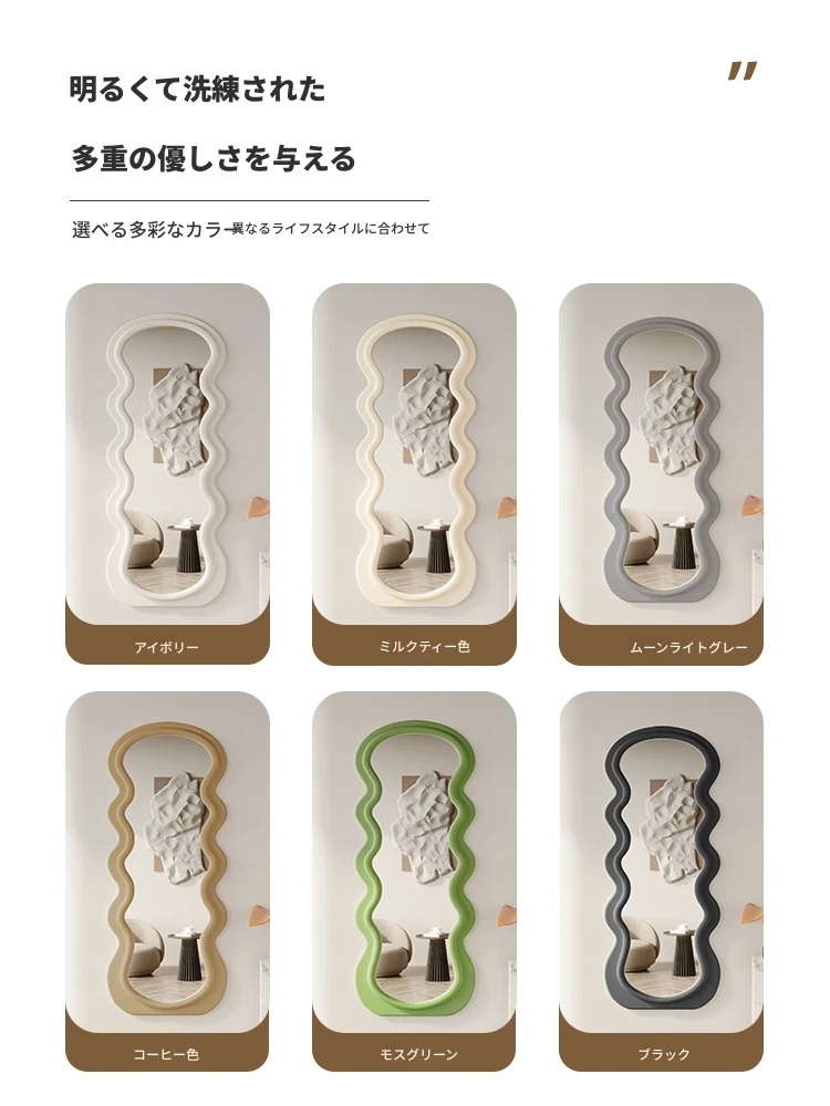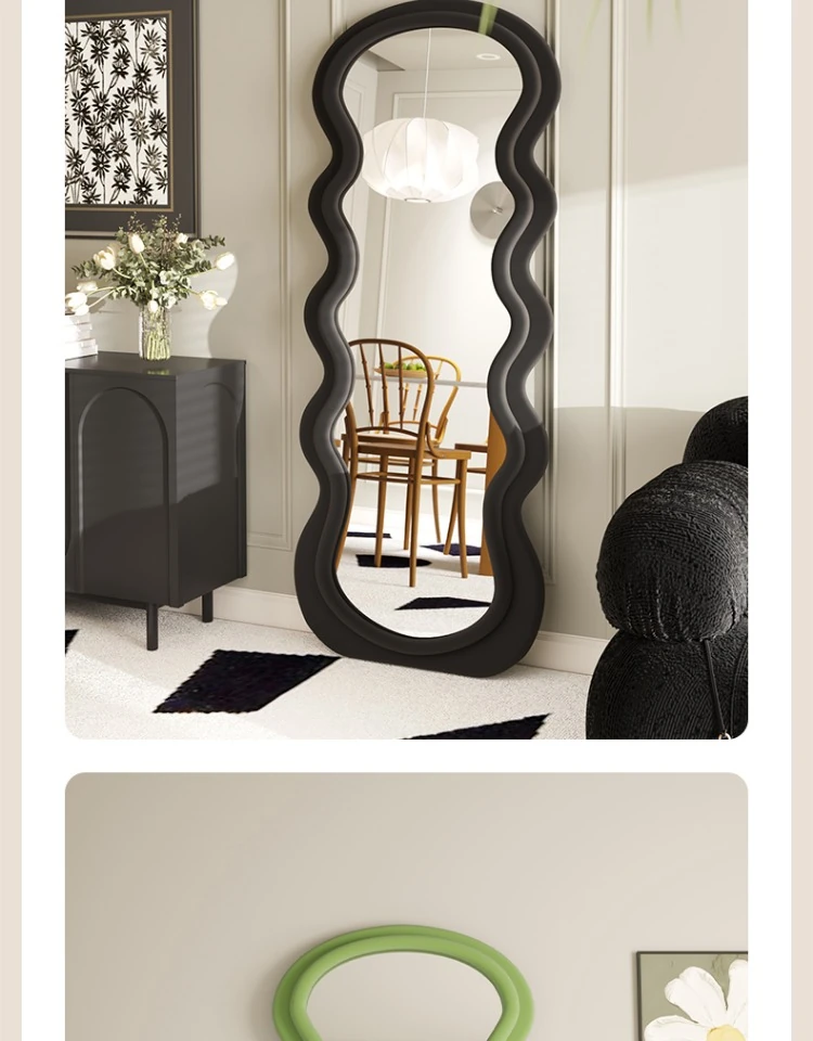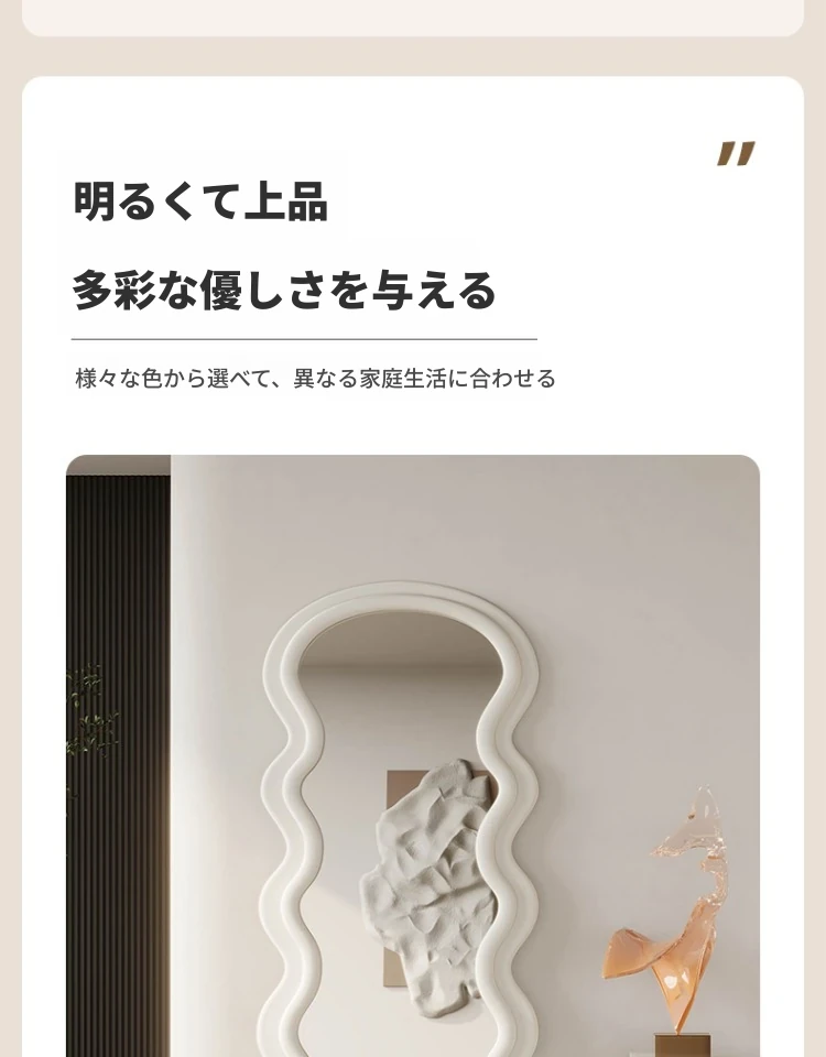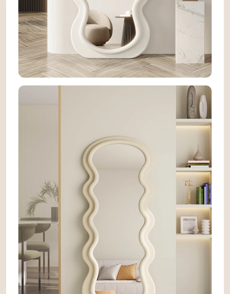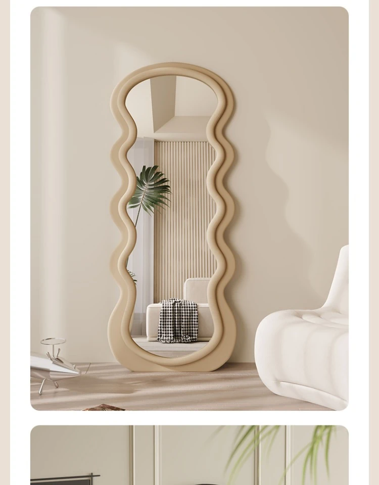 波浪デザインのクリーム風全身鏡|おしゃれなウォールミラー|自宅用のスタイリッシュなドレッシングミラー|トレンド感満載のユニークな形状で、寝室やエントランスに最適!