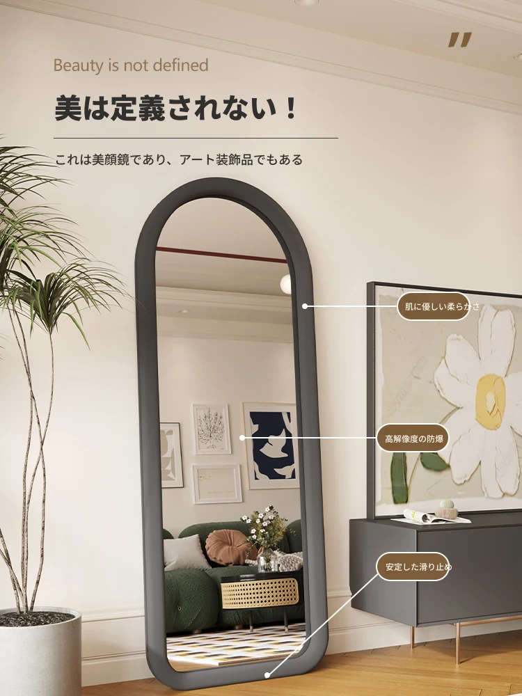 インスタ風全身鏡!落地式の高級感漂う寝室用ミラー。おしゃれな入居者必見!歪みのないリアルな映像で、完璧なコーディネートが楽しめます。あなたのスタイルを引き立てる理想のアイテム!