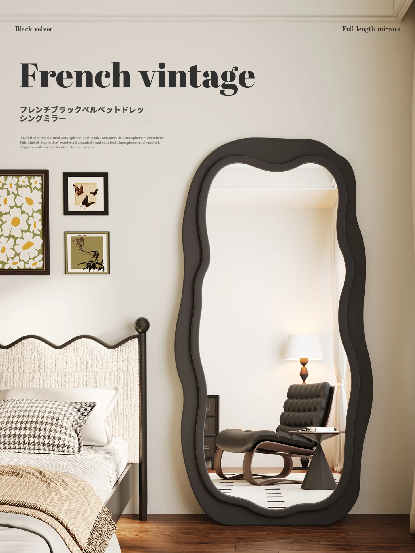 異形デザインのラグジュアリー全身鏡!おしゃれな波型の立て掛け鏡で、自宅でのフィッティングが特別な体験に。高級感溢れるブラックカラーで、インテリアにもぴったり。あなたのスタイルを引き立てる一品です。