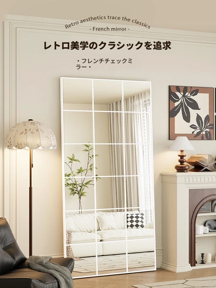 レトロ全身鏡・フロアミラー・家庭用フレンチチェックデザイン・リビングルームの壁掛け装飾鏡・コーディネート用ミラー・上質な軽奢感を演出!あなたの部屋を華やかに彩るアイテムです。