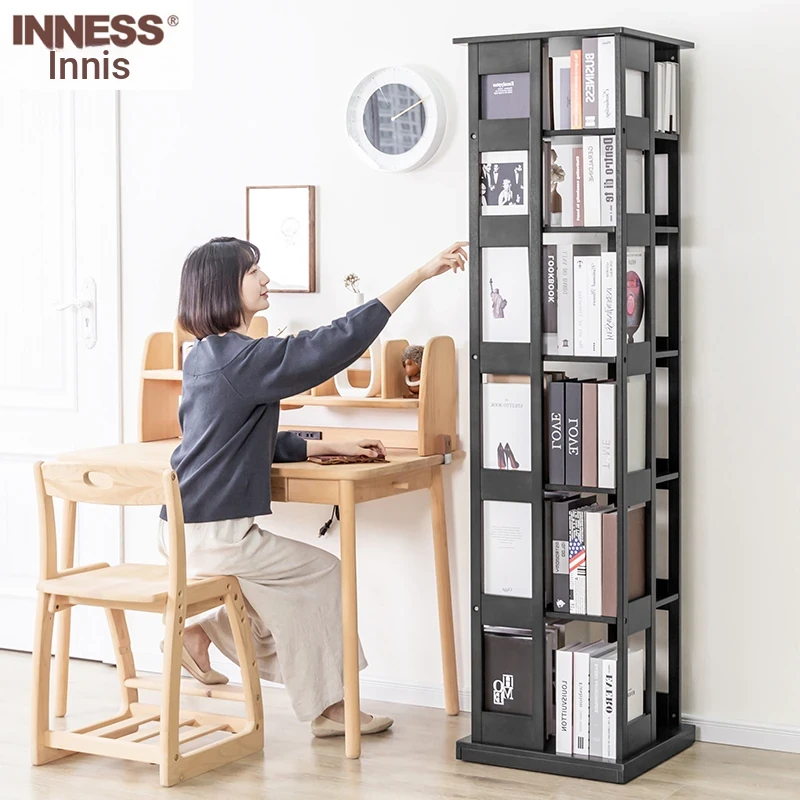 Innis Solid Wood Black Rotating Bookshelf - Stylish Floor Storage Unit for Home, Living Room & Kids' Room - Perfect for Organizing Storybooks and Toys